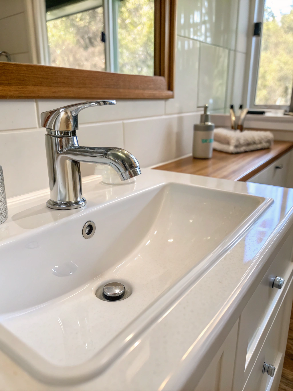 Tap and fixture descaling is one of the most noticeable transformations in a bathroom deep clean. Calcium and mineral deposits from Newcastle’s water supply build up around tap bases, spouts and handles, leaving that chalky white residue that makes fixtures look old and worn. We use professional descaling solutions to dissolve the buildup and restore the finish without damaging chrome or brushed metal surfaces. The sink basin gets a full descale and polish, drains are treated and cleared, and mirrors are cleaned to a streak-free finish using professional glass product. The overall result is a vanity area that looks and functions the way it should — clean, clear and properly maintained.
